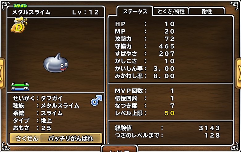 因みに仲間になったメタルスライムの性格はタフガイで、こちらはHPと攻撃が伸びやすい性格のようです。