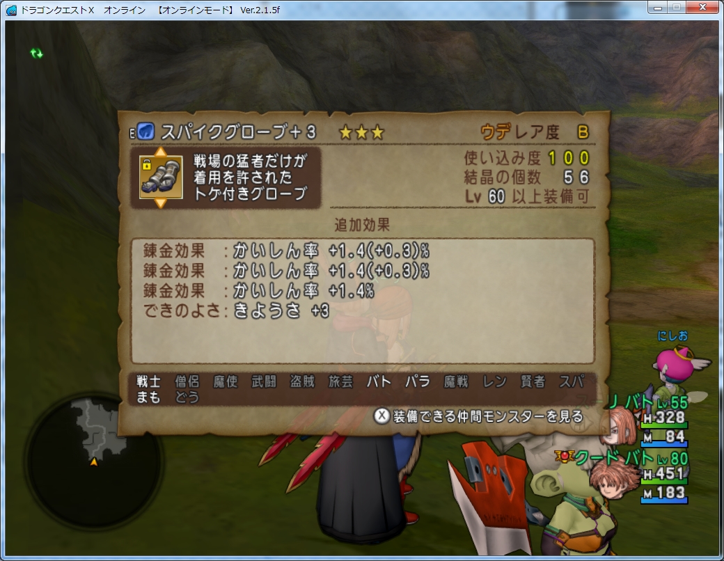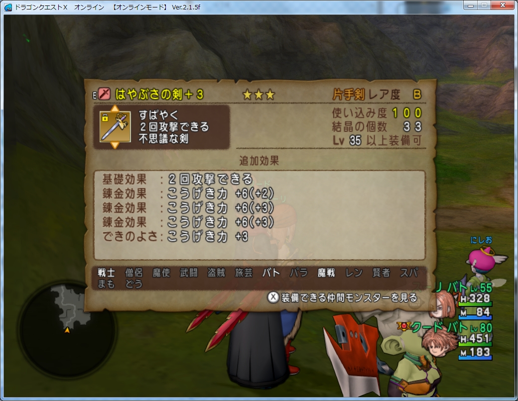 他にも不意を付きやすい、アイテムを盗みやすいという効果もきようさにはあるようですが、バトマスの戦闘にはあまり意味が無いので会心率だけ見てます。
