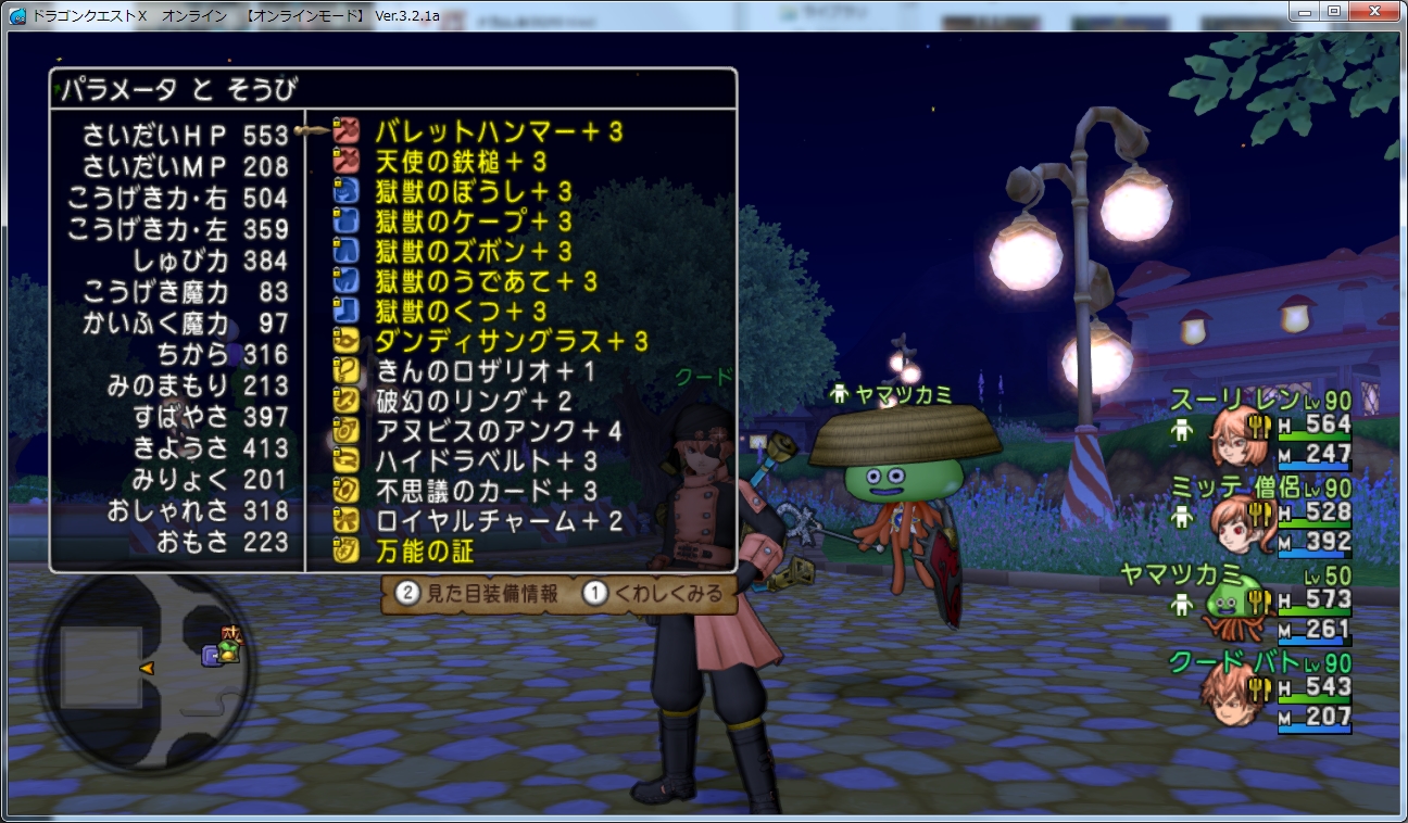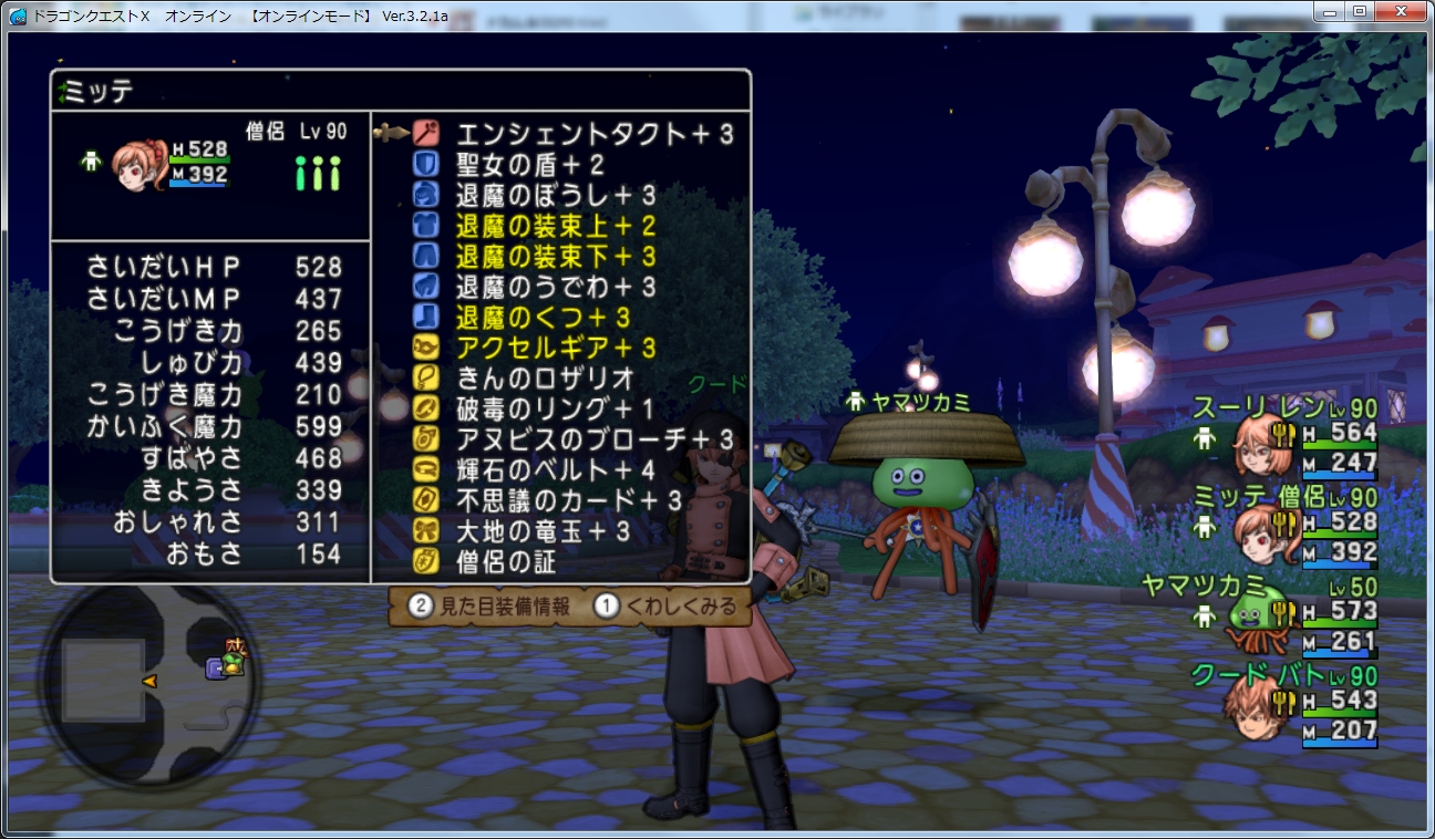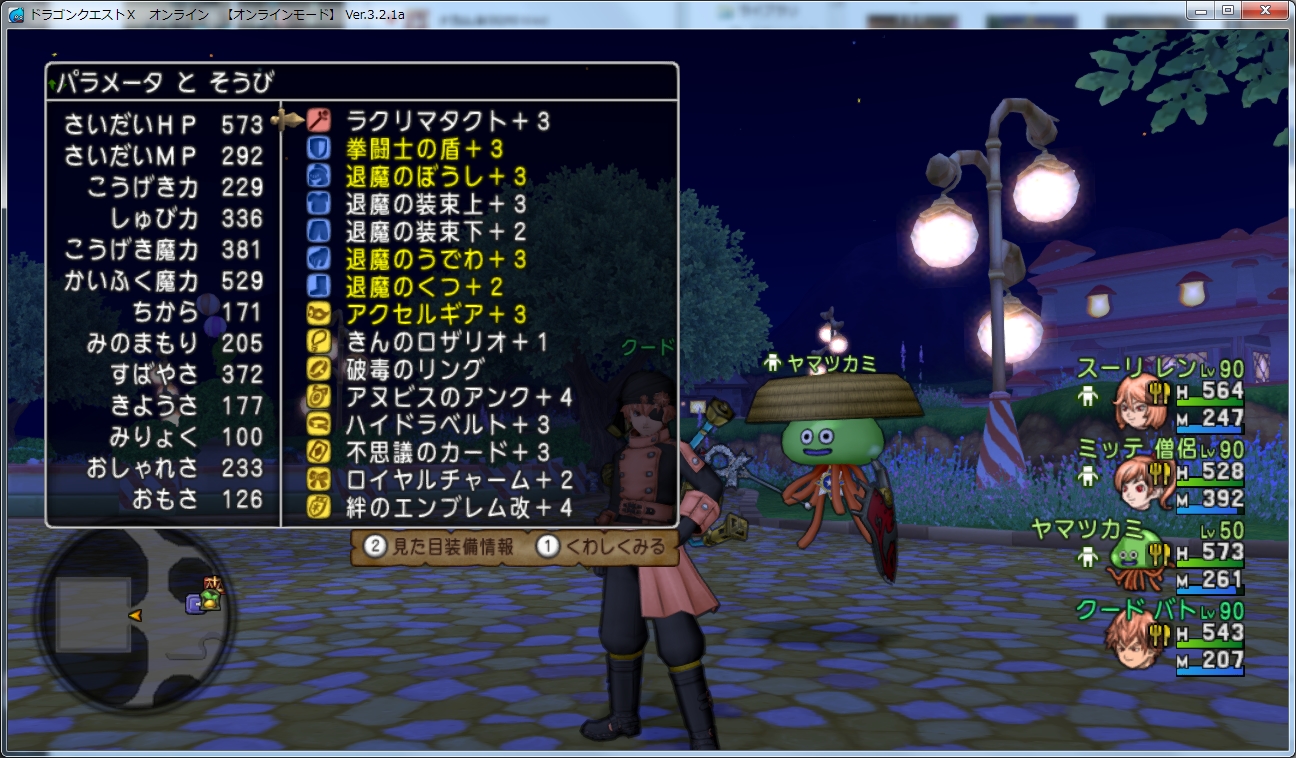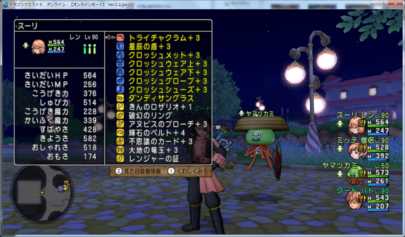 ネタバレ回避のついでに、今回のパーティのステータスと簡単な装備および宝珠の説明を。
