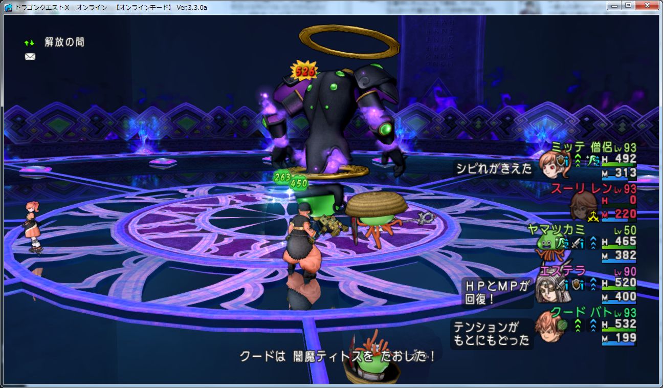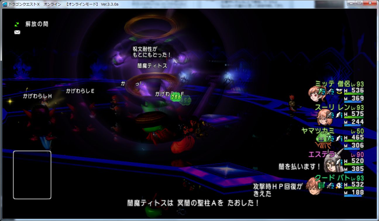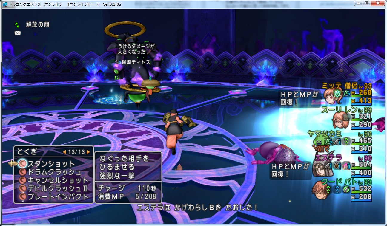 エステラの詠唱が完了するとティトスがスタン+守備力低下、かげわらしが残っているとそれも自動で消滅、画像右のほうにある陣の上に立っているとHPとMPが999回復します。