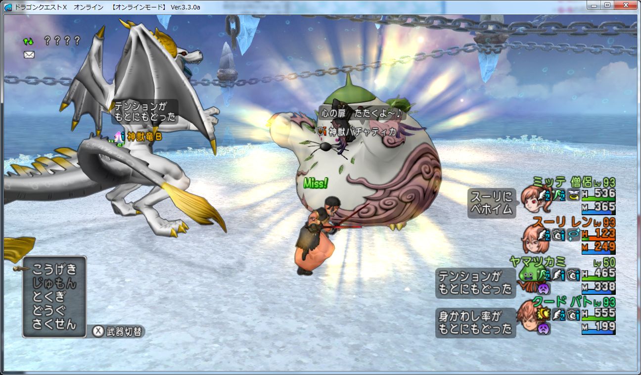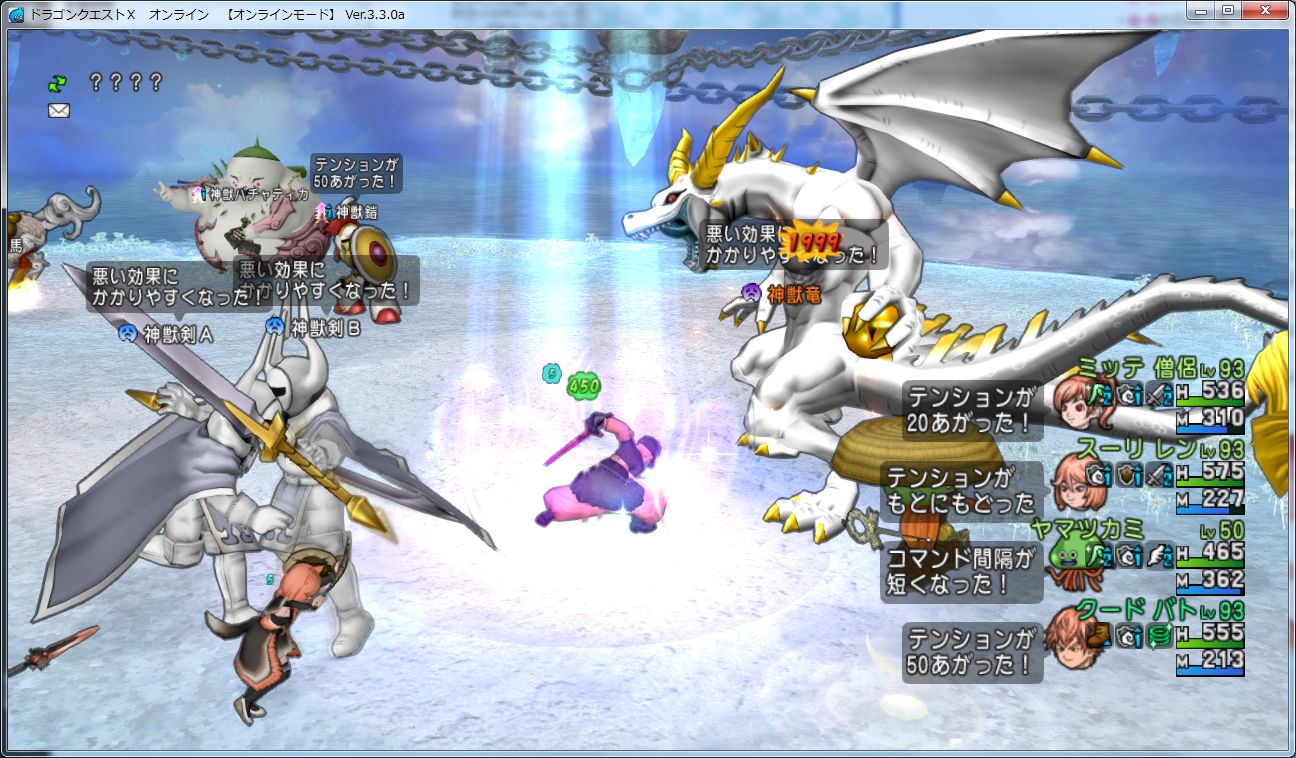 周りの神剣たちがマヒャドデスを撃ってくるので危険な効果に思えますが、マヒャドデスは素だと180ぐらいのダメージしか受けないのでテンション5では大した威力でもないです。