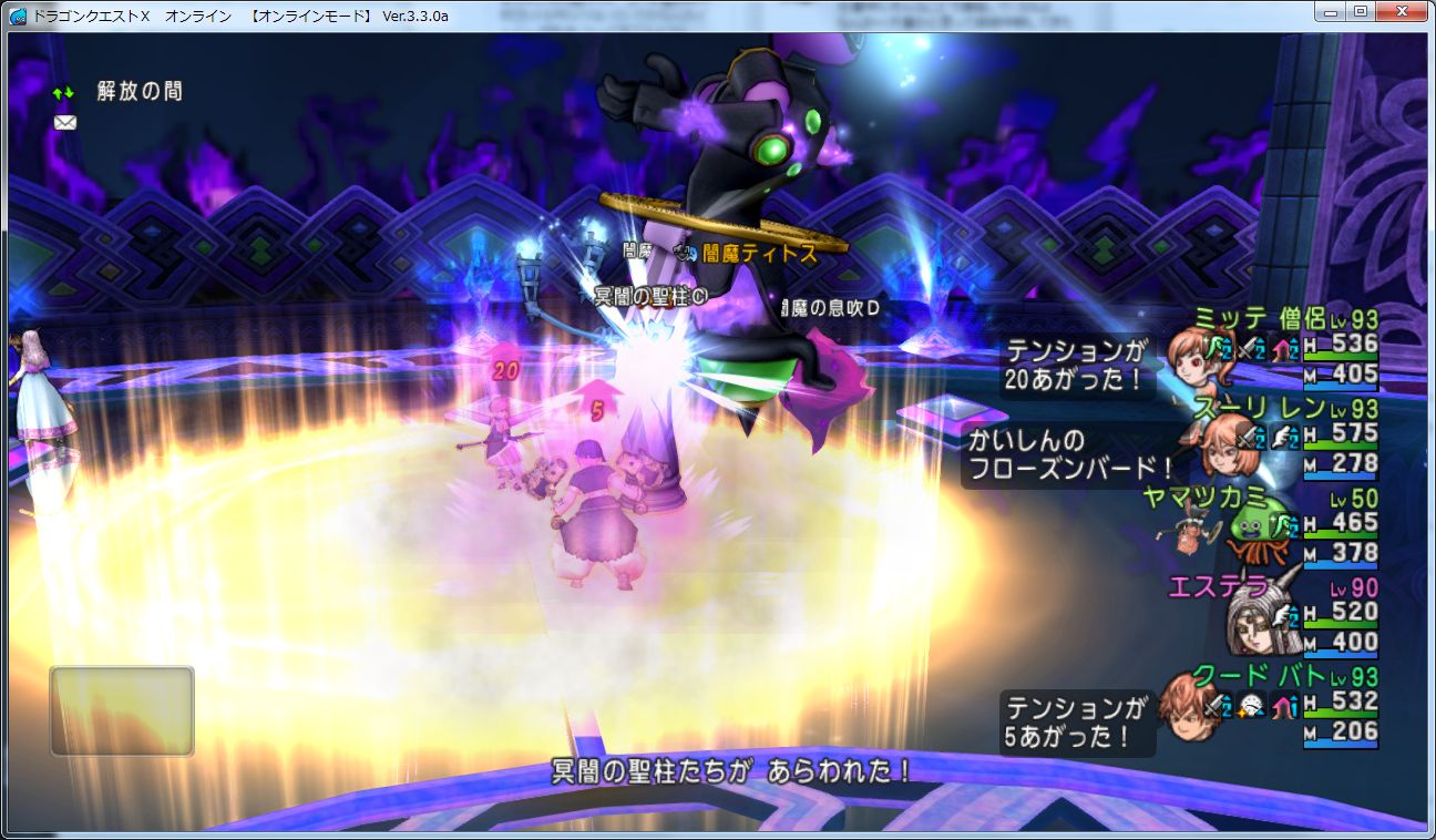 エステラの詠唱が完了するとティトスがスタン+守備力低下、かげわらしが残っているとそれも自動で消滅、画像右のほうにある陣の上に立っているとHPとMPが999回復します。
