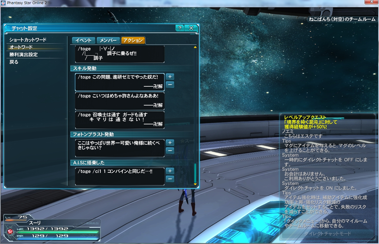 PSO2(ファンタシースターオンライン2)にある機能なのですが、簡単に言うと「一定の条件でランダムに自キャラが発言する」という機能です。