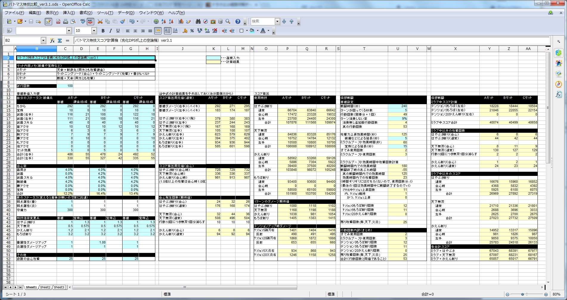 各特技による効率は分かったけど、じゃあ実際にはどうなの?ミラクルブーストもろば使うよね?という疑問から新しく計算しました。